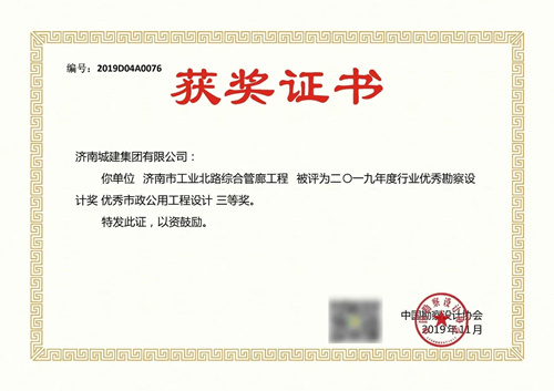 濟南市工業(yè)北路綜合管廊工程被評為2019年度行業(yè)優(yōu)秀勘察設(shè)計獎優(yōu)秀市政公用工程設(shè)計三等獎