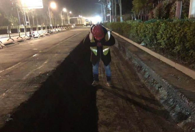 任務(wù)緊急、刻不容緩。項(xiàng)目部開(kāi)工即沖鋒,倒排工期,快速組織,針對(duì)港西路現(xiàn)狀施工條件及交通狀況,反復(fù)優(yōu)化施工方案、合理安排施工工序,全力以赴投入施工,僅用四天就把主線(xiàn)溝槽全部打通。施工中堅(jiān)持標(biāo)準(zhǔn)、嚴(yán)守底線(xiàn),為確保美觀(guān),將瀝青接縫全部設(shè)置在標(biāo)線(xiàn)下;為避免施工工期加長(zhǎng),所有與地下管線(xiàn)沖突位置均根據(jù)給水安裝規(guī)范進(jìn)行管道順接,盡量不使用鋼制彎頭焊接。針對(duì)施工難點(diǎn),項(xiàng)目部積極協(xié)同監(jiān)理、安裝單位、建設(shè)單位召開(kāi)討論會(huì),并嚴(yán)格按確定方案落實(shí),主動(dòng)協(xié)助供水管道安裝隊(duì)伍解決進(jìn)度慢的問(wèn)題,共同提升施工進(jìn)展。