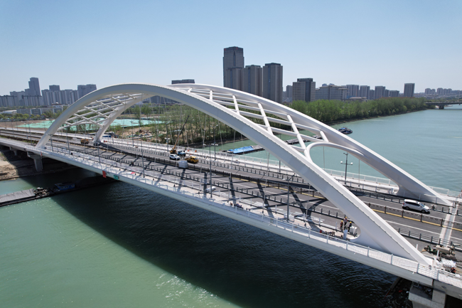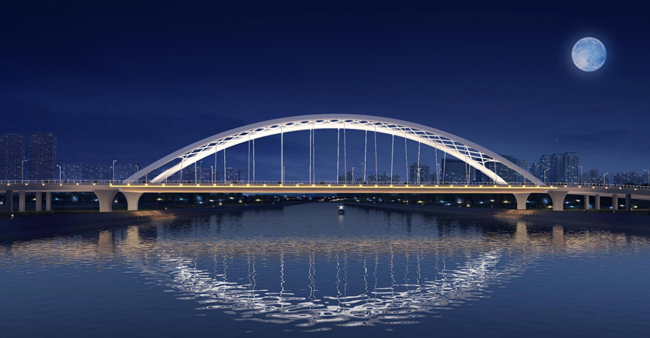 集團(tuán)承建的二里橋路跨京杭運(yùn)河節(jié)點(diǎn)工程(曲江大橋)項(xiàng)目連續(xù)上跨濱河西路、京杭運(yùn)河、東外灘路(規(guī)劃),主橋采用“鋼箱提籃拱”結(jié)構(gòu),由拱肋和交織的橫撐組成,相依相靠,形成穩(wěn)定結(jié)構(gòu)。設(shè)計靈感源自揚(yáng)州“月亮城”的文化意象。側(cè)觀橋體,兩向內(nèi)收攏的拱肋形如彎月,網(wǎng)狀橫撐交織成輕盈的弧線;夜間燈光亮起時,橋影與水中明月相映成趣,恰似“二分明月落長河”的詩意畫卷。橋型勾勒出了古樸靜謐的揚(yáng)州,穿越千年,風(fēng)姿如故,它宜清風(fēng)、宜月色,人與自然相互包容,與揚(yáng)州打造“文化旅游名城、生態(tài)宜居名城” 的規(guī)劃相得益彰。
