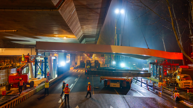 濟南百花公園過街天橋創(chuàng)新應(yīng)用低凈空吊裝技術(shù)實現(xiàn)精準(zhǔn)吊裝