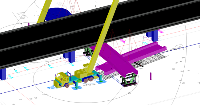 濟南百花公園過街天橋在主橋鋼箱梁吊裝中引入多項技術(shù)手段破解低凈空難題。項目前期部署環(huán)節(jié),項目部提前在場外劃定專用存梁區(qū),將兩幅鋼箱梁的全部拼裝焊接工作外移,降低現(xiàn)場作業(yè)對交通的影響,顯著減少現(xiàn)場吊裝工序風(fēng)險點。項目技術(shù)團隊對現(xiàn)場工況進行三維精細(xì)化建模,提前識別方案中兩處潛在碰撞風(fēng)險,及時優(yōu)化吊裝路徑。吊裝定位方面,針對低凈空作業(yè)中“看不見、測不準(zhǔn)”的痛點,項目部提前對吊車支腿、運梁車停靠點進行精準(zhǔn)放樣、標(biāo)識,同時根據(jù)3D模擬得出的鋼絲繩理論角度,利用激光束進行空間投射校核,將抽象的吊裝軌跡轉(zhuǎn)化為可視化的光束路徑,確保精準(zhǔn)吊裝。這套融合工序前置、數(shù)字模擬與可視化校核的解決方案,為后續(xù)同類低凈空工況施工提供了可復(fù)用的技術(shù)路徑。