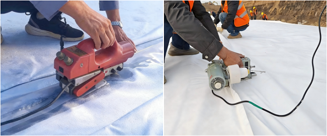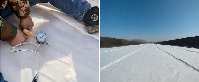 濟寧高新區(qū)城鄉(xiāng)供水一體化提升工程(一期)EPC總承包項目成功應(yīng)用復(fù)合土工膜熱熔焊接及縫合創(chuàng)新技術(shù)攻堅水庫防滲施工難點。項目團隊采用智能行走雙軌熱熔焊機雙焊縫同時焊接工藝,通過紅外測溫與實時反饋自動調(diào)控溫度,搭配寬主縫+窄副縫雙焊縫結(jié)構(gòu),實現(xiàn)焊縫均勻密實。針對構(gòu)筑物銜接、坡體轉(zhuǎn)角等難點部位,采用預(yù)留搭接、階梯焊接、分段焊接等專項工藝,確保復(fù)雜區(qū)域防滲無死角。同步升級真空+氣壓檢測體系,實現(xiàn)焊縫質(zhì)量全流程可追溯;針對容易產(chǎn)生滲漏的十字型交叉焊縫、T字型焊縫、焊縫修補位置、庫底陰陽角及水庫進出水口,同步采用超聲波檢測技術(shù),實現(xiàn)重點部位雙重管控。在土工布縫合方面,創(chuàng)新雙針雙線+鎖邊加固工藝,并采用“先縫合后焊接”協(xié)同工序,避免穿刺滲漏與高溫?fù)p傷,提升整體結(jié)構(gòu)穩(wěn)定性。項目團隊開展多項工藝優(yōu)化與技術(shù)創(chuàng)新,形成一套智能、高效、可靠的防滲施工體系,防滲可靠性、施工效率、工程耐久性均實現(xiàn)顯著提升,焊縫合格率大幅提高,施工成本有效降低。